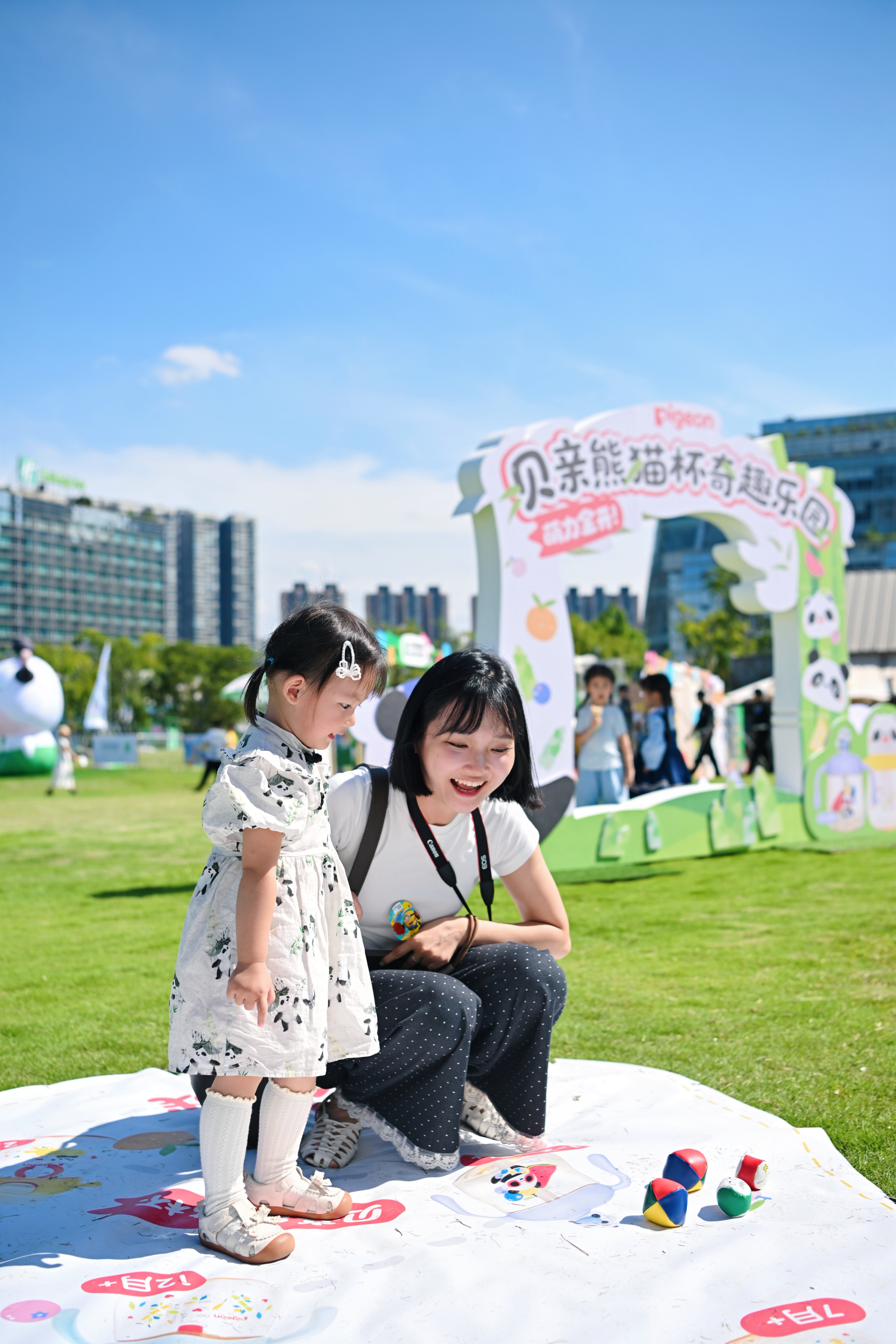 走进乐园,熊猫元素如同灵动的纽带,将ip魅力与产品特色紧紧串联:由畅畅、嘟嘟、悠悠组成的贝亲熊猫拍照立牌前,孩子们排着队争相合影,萌趣的熊猫形象与摆出搞怪姿势的孩子相映成趣;熊猫手举牌、投球大作战等互动装置设于草坪各处,家长们忙着用手机抓拍孩子奔跑玩耍的瞬间,孩子们则在游戏区里欢呼雀跃,整个乐园都洋溢着轻松愉悦的氛围。