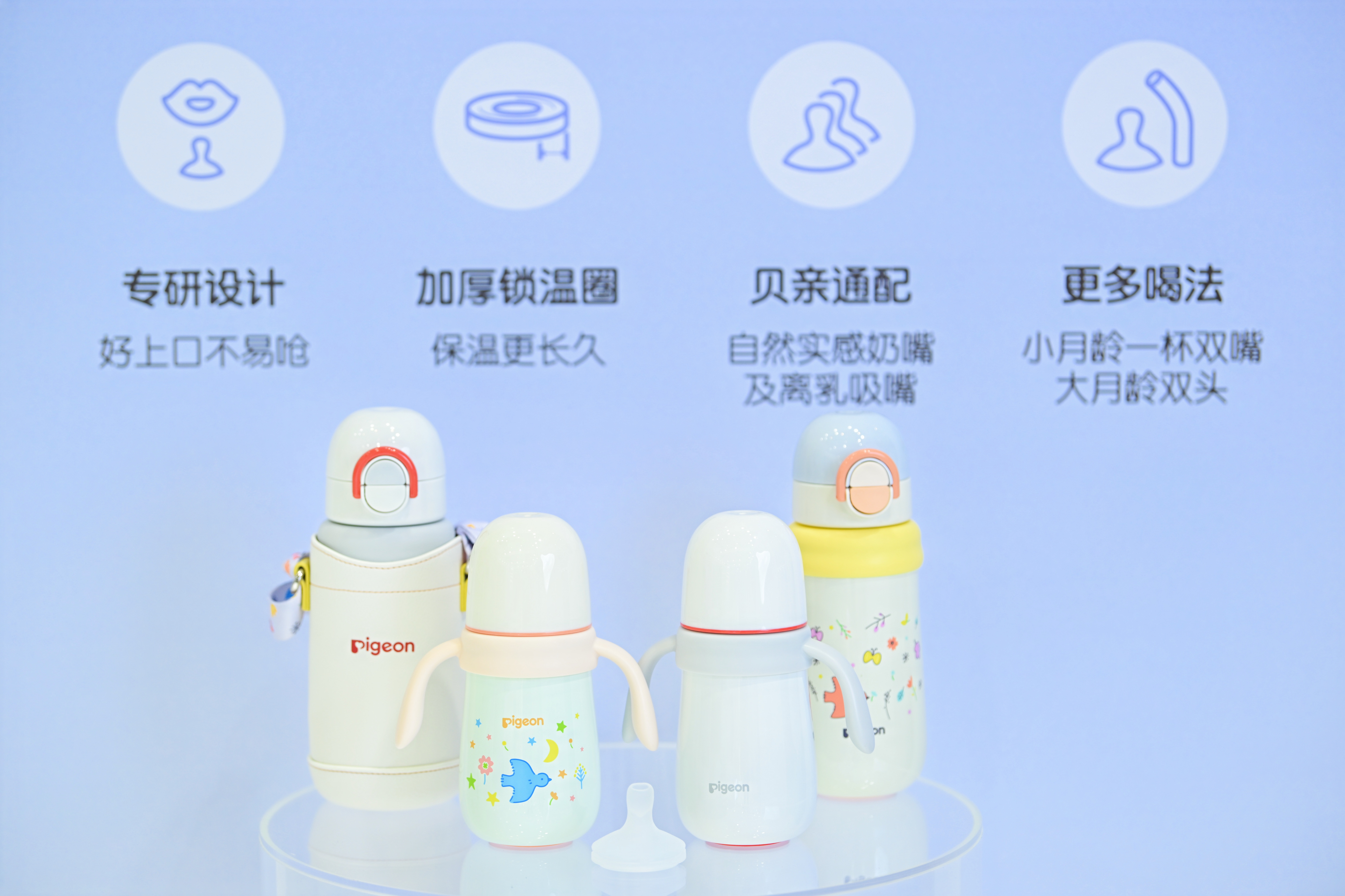 步入展台,温馨柔和的灯光洒落,前沿科技与亲子关爱相融的视觉呈现令人眼前一亮。此次参展,贝亲携新品自然学饮系列保温杯重磅亮相。秉承70年专研新生儿的科学积淀,贝亲基于不同月龄宝宝的口腔运动、唇形发育特点,设计不同的开口及流速。此外,保温杯还可通配贝亲自然实感奶嘴及离乳吸嘴,灵活满足多样喂养需求。搭载的加厚锁温圈既能满足宝宝日常学饮的温度需求,也为家长户外带娃时的饮水保温带来便利。